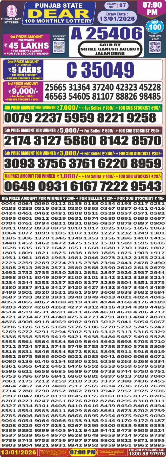 Dear 100 Monthly lottery Result 13.01.2026 7PM 13.01.2026 Leave a Comment on Dear 100 Monthly lottery Result 13.01.2026 7PM Share: XFacebookPinterestLinkedin