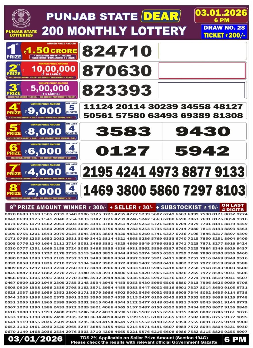 Dear 200 Monthly lottery 6 PM Results 03.01.2026 03.01.2026 Leave a Comment on Dear 200 Monthly lottery 6 PM Results 03.01.2026 Share: XFacebookPinterestLinkedin
