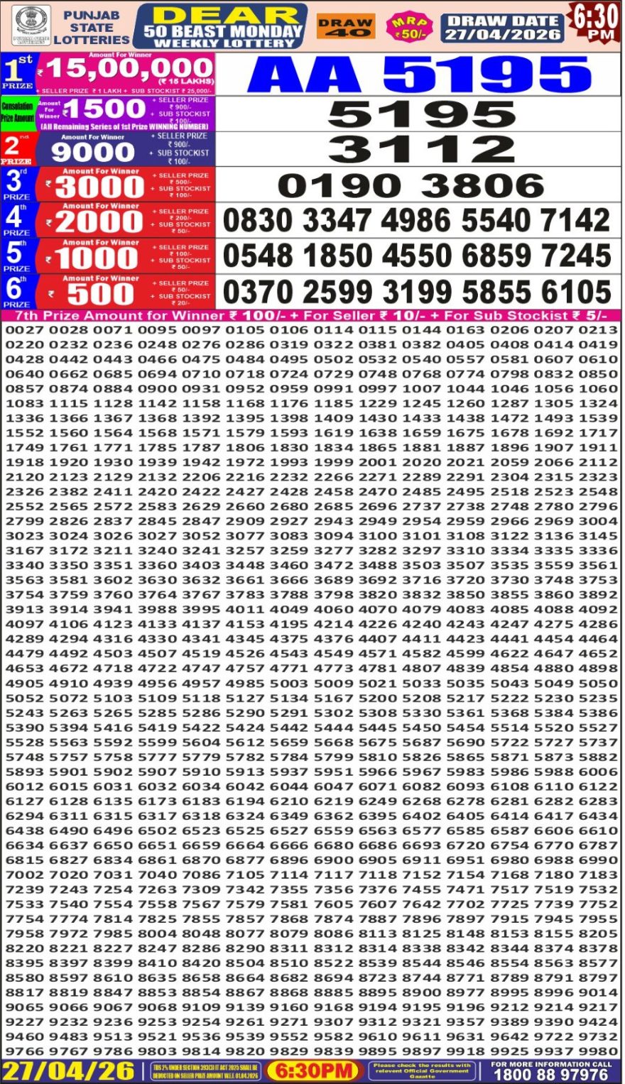 Dear 50 lottery Result 27.04.2026 6:30PM 27.04.2026 Leave a Comment on Dear 50 lottery Result 27.04.2026 6:30PM Share: XFacebookPinterestLinkedin