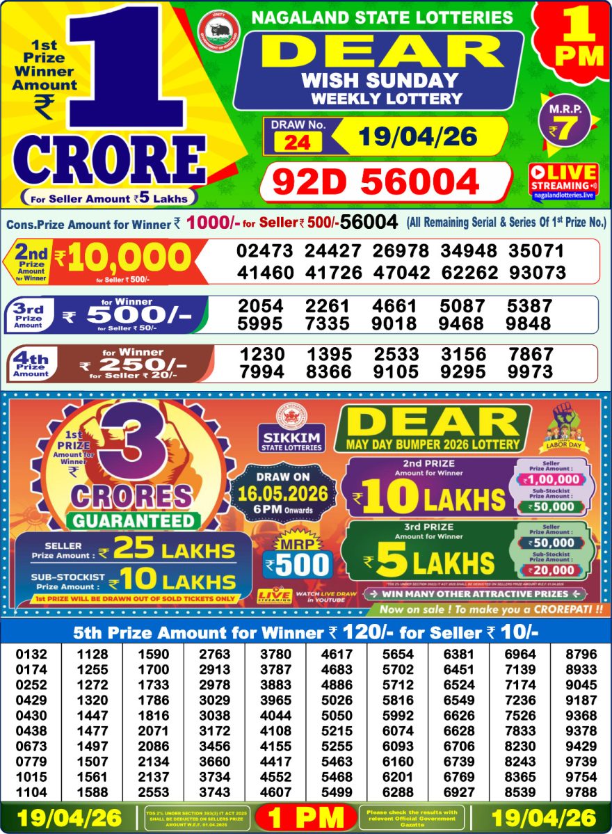 Dear lottery 1 PM Results 19.04.2026 19.04.2026 Leave a Comment on Dear lottery 1 PM Results 19.04.2026 Share: XFacebookPinterestLinkedin