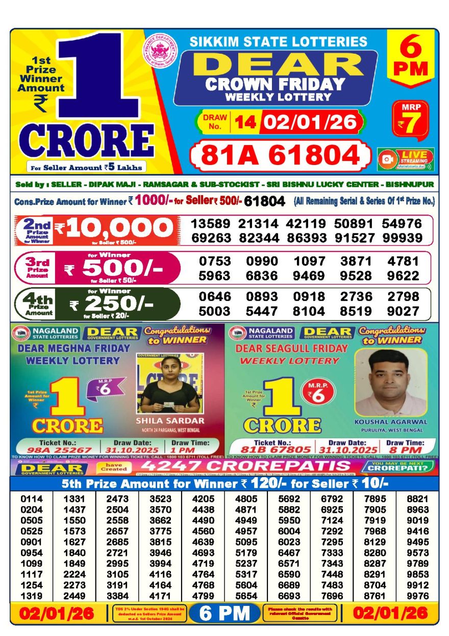 Dear lottery 6 PM Results 02.01.2026 02.01.2026 Leave a Comment on Dear lottery 6 PM Results 02.01.2026 Share: XFacebookPinterestLinkedin
