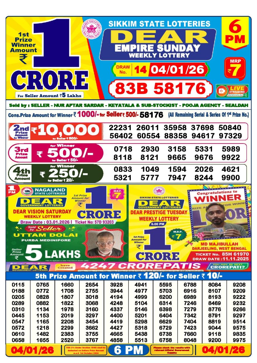 Dear lottery 6 PM Results 04.01.2026 04.01.2026 Leave a Comment on Dear lottery 6 PM Results 04.01.2026 Share: XFacebookPinterestLinkedin