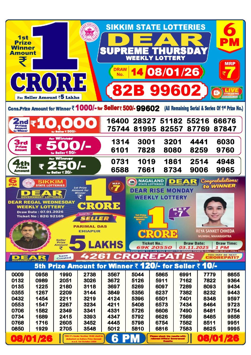 Dear lottery 6 PM Results 08.01.2026 08.01.2026 Leave a Comment on Dear lottery 6 PM Results 08.01.2026 Share: XFacebookPinterestLinkedin