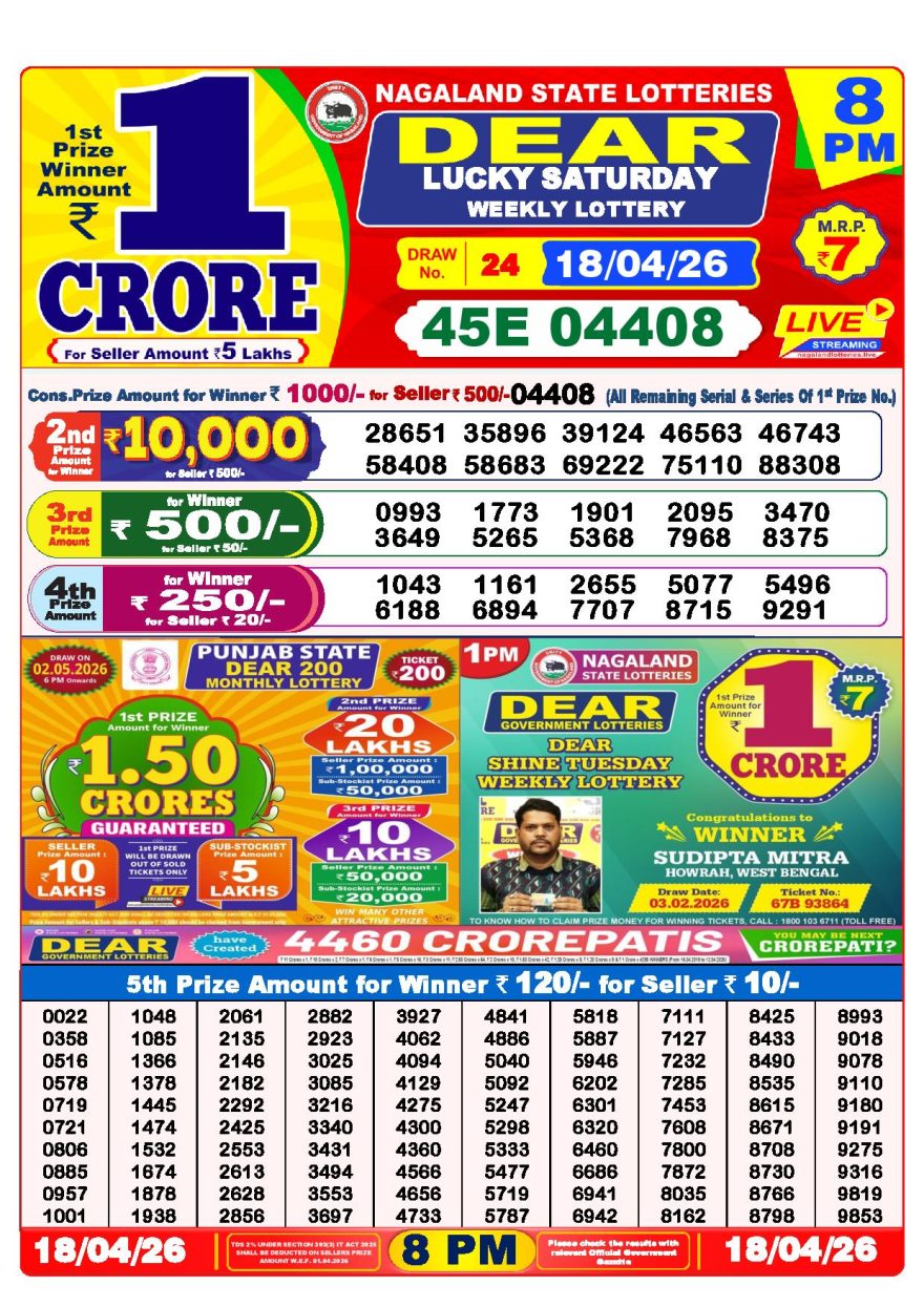 Dear lottery 8 PM Results 18.04.2026 18.04.2026 Leave a Comment on Dear lottery 8 PM Results 18.04.2026 Share: XFacebookPinterestLinkedin