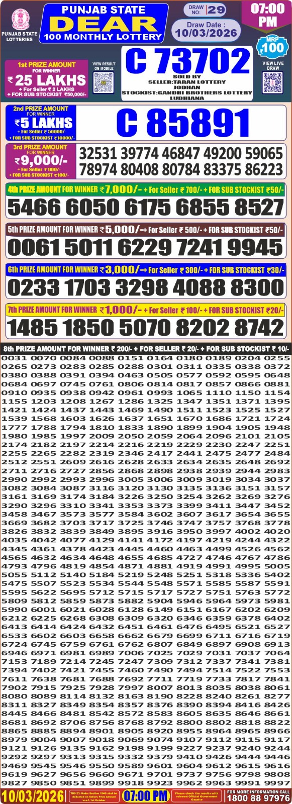 Punjab State Dear 100 Monthly lottery 7 PM Results 10.03.2026 10.03.2026 Leave a Comment on Punjab State Dear 100 Monthly lottery 7 PM Results 10.03.2026 Share: XFacebookPinterestLinkedin