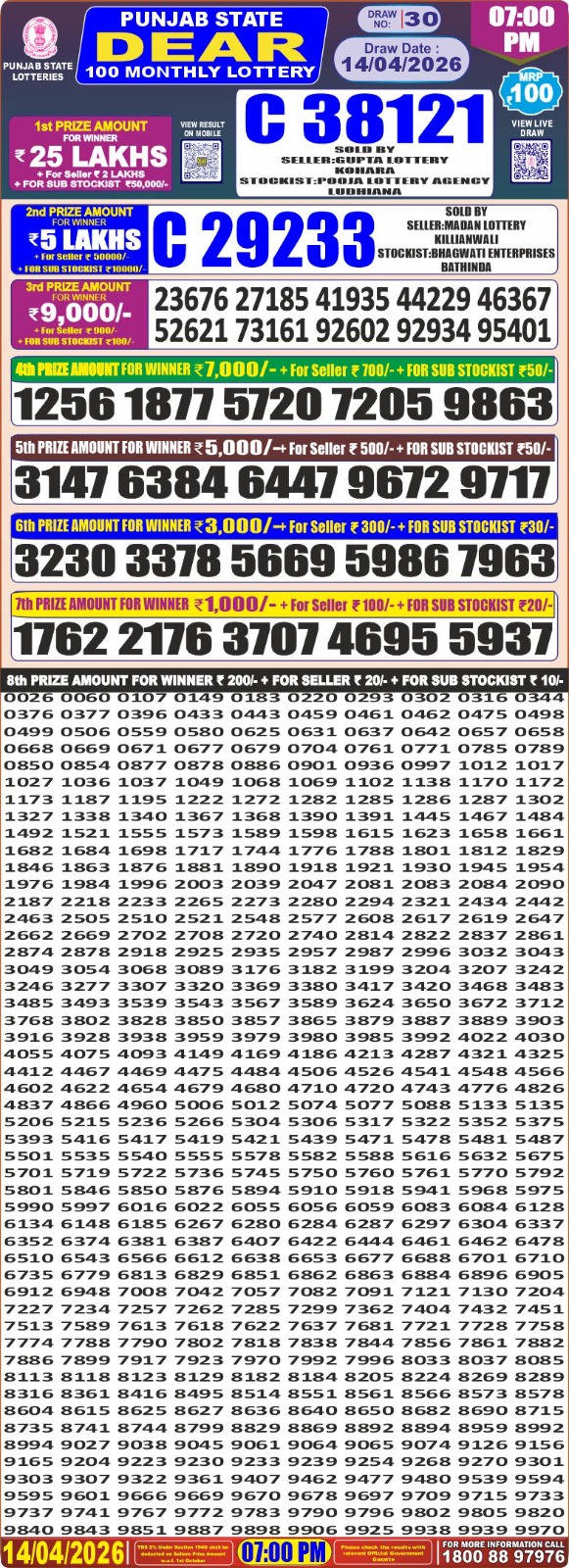 Punjab State Dear 100 Monthly lottery 7 PM Results 14.04.2026 14.04.2026 Leave a Comment on Punjab State Dear 100 Monthly lottery 7 PM Results 14.04.2026 Share: XFacebookPinterestLinkedin