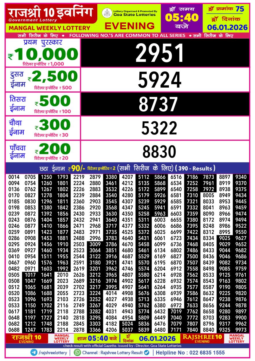 Rajshree 10 Evening lottery 05.40 PM 06.01.2026 06.01.2026 Leave a Comment on Rajshree 10 Evening lottery 05.40 PM 06.01.2026 Share: XFacebookPinterestLinkedin