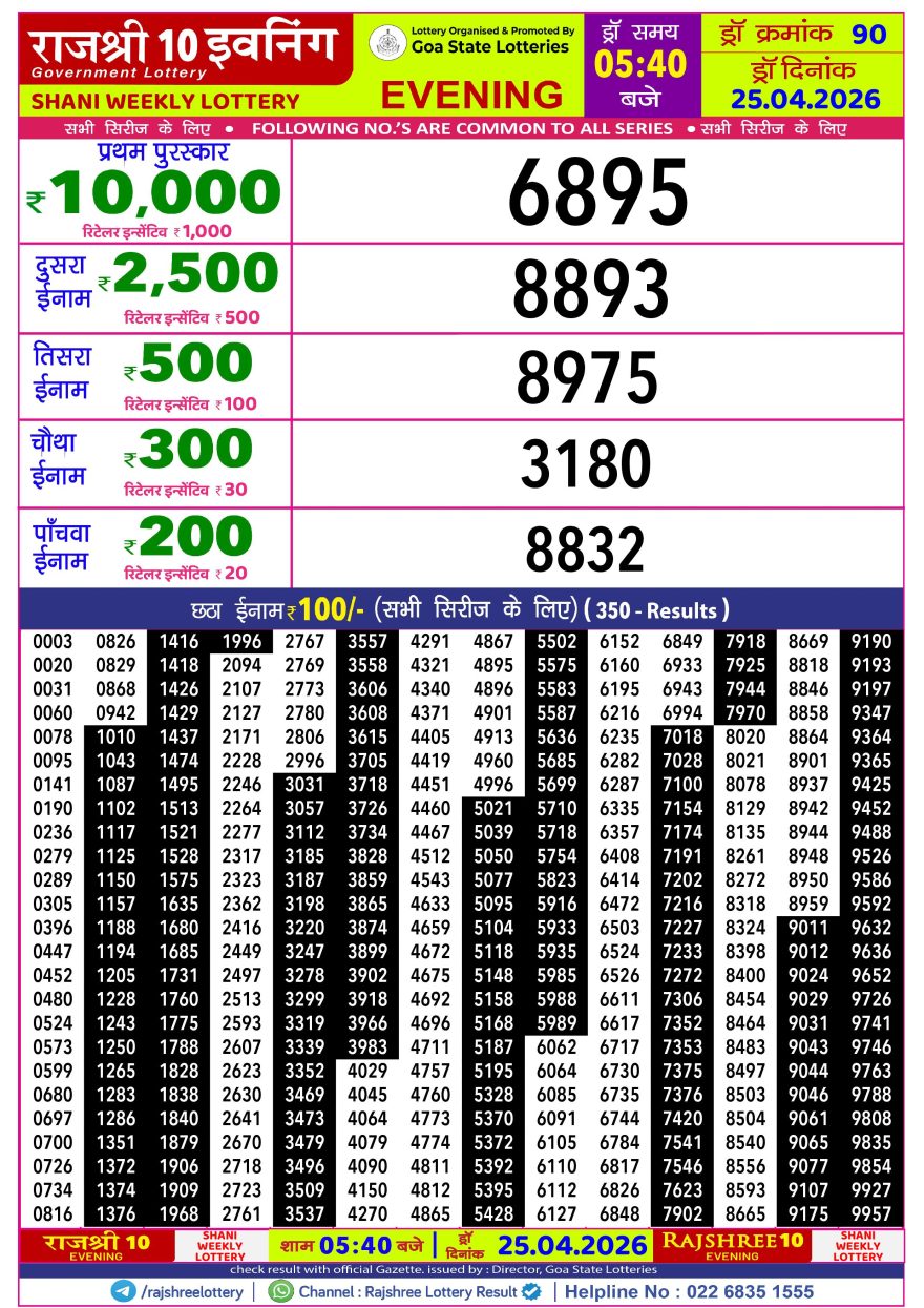 Rajshree 10 Evening lottery 05.40 PM 25.04.2026 25.04.2026 Leave a Comment on Rajshree 10 Evening lottery 05.40 PM 25.04.2026 Share: XFacebookPinterestLinkedin