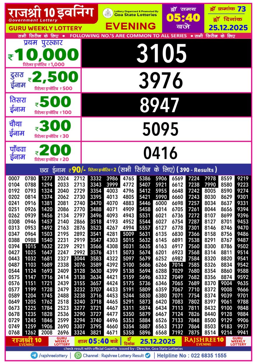 Rajshree 10 Evening lottery 05.40 PM 25.12.2025 25.12.2025 Leave a Comment on Rajshree 10 Evening lottery 05.40 PM 25.12.2025 Share: XFacebookPinterestLinkedin
