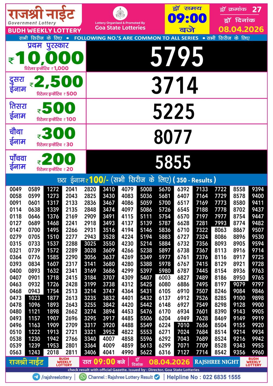 Rajshree 30 Budh Weekly lottery 09.00PM 08.04.2026 08.04.2026 Leave a Comment on Rajshree 30 Budh Weekly lottery 09.00PM 08.04.2026 Share: XFacebookPinterestLinkedin