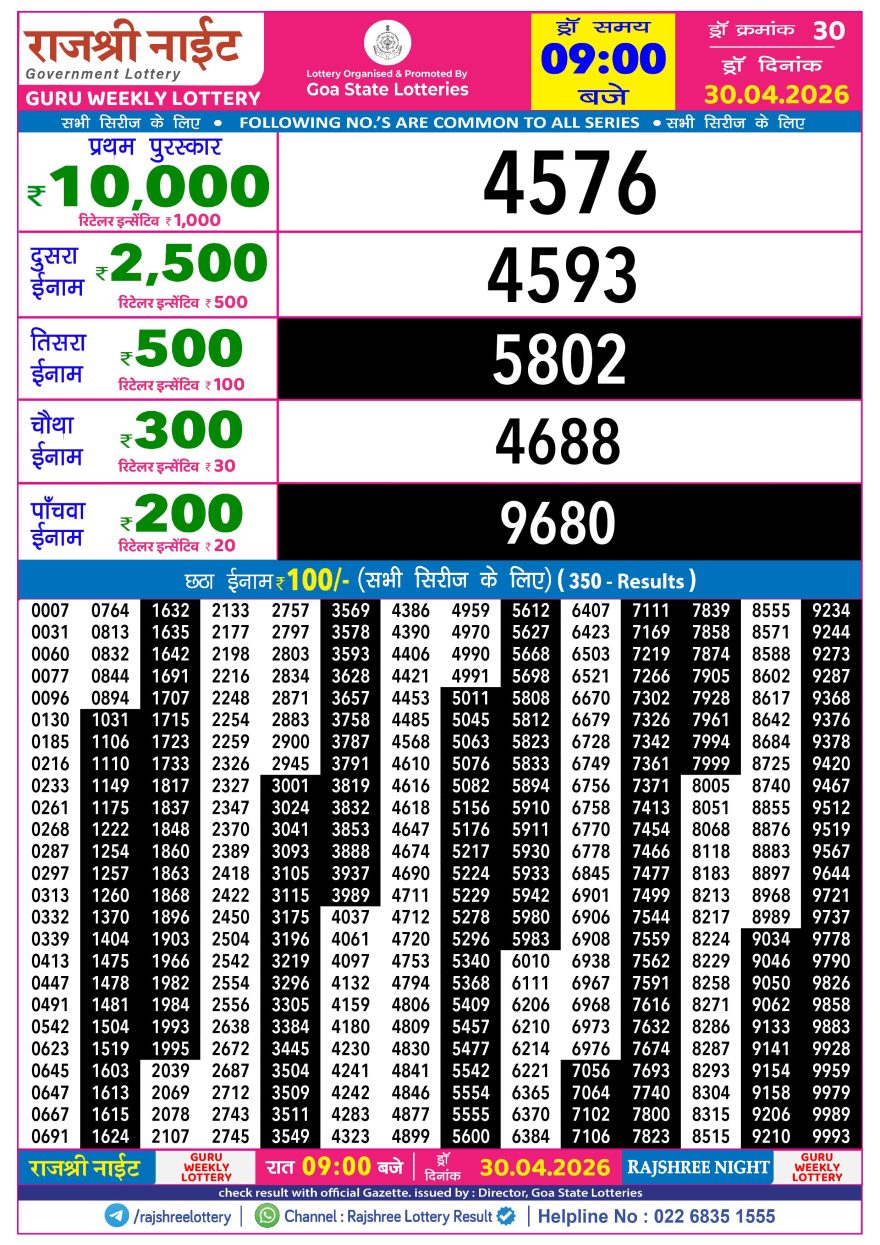 Rajshree 30 Guru Weekly lottery 09.00PM 30.04.2026 30.04.2026 Leave a Comment on Rajshree 30 Guru Weekly lottery 09.00PM 30.04.2026 Share: XFacebookPinterestLinkedin