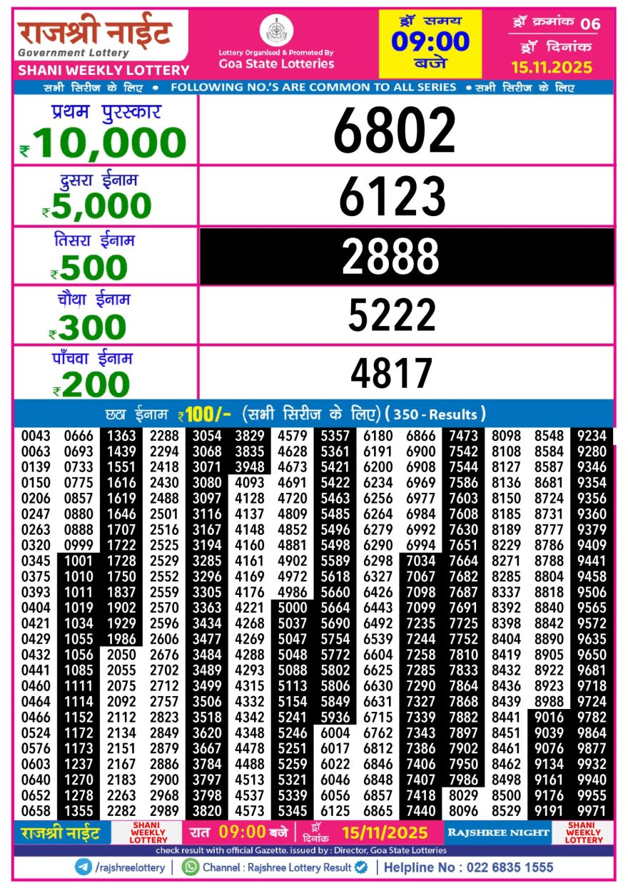 Rajshree 30 Shani Weekly lottery 09.00PM 15.11.2025 15.11.2025 Leave a Comment on Rajshree 30 Shani Weekly lottery 09.00PM 15.11.2025 Share: XFacebookPinterestLinkedin