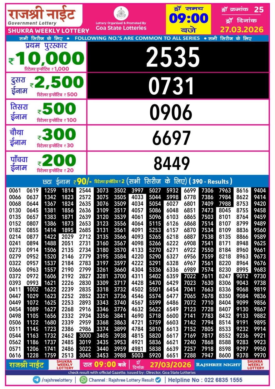 Rajshree 30 Shukra Weekly lottery 09.00PM 27.03.2026 27.03.2026 Leave a Comment on Rajshree 30 Shukra Weekly lottery 09.00PM 27.03.2026 Share: XFacebookPinterestLinkedin