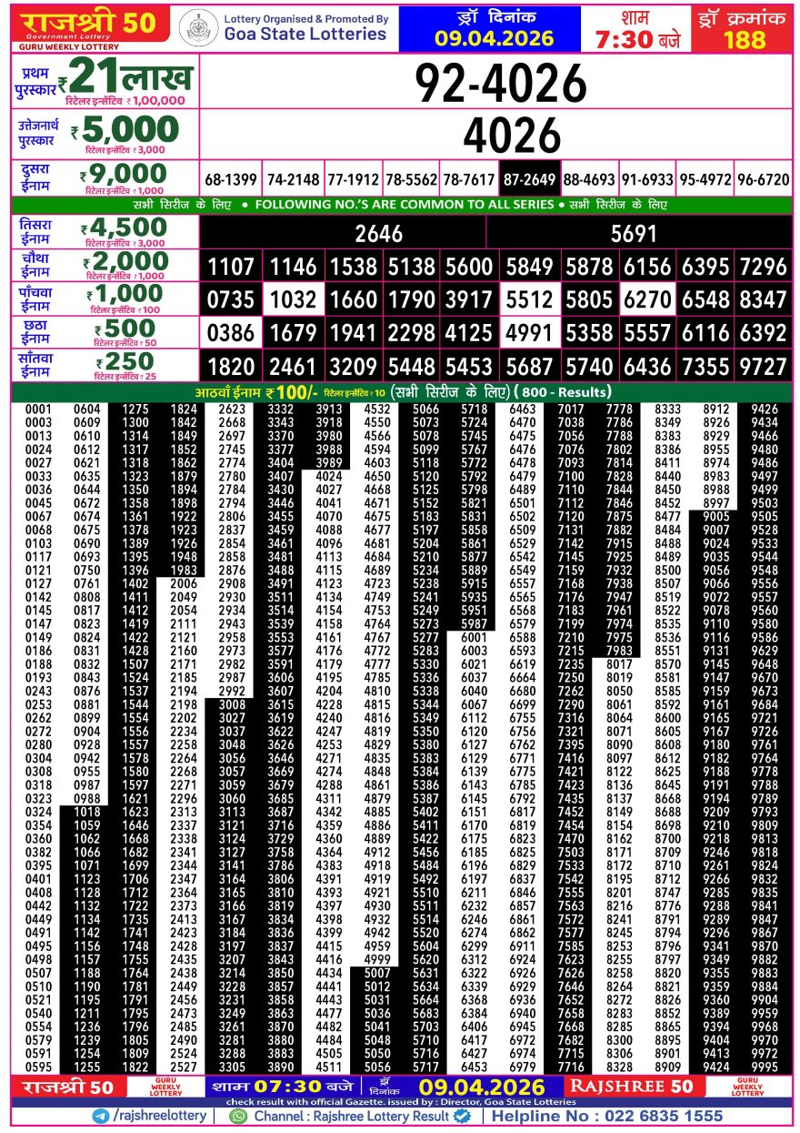 Rajshree 50 Guru Weekly lottery 07.30PM 09.04.2026 09.04.2026 Leave a Comment on Rajshree 50 Guru Weekly lottery 07.30PM 09.04.2026 Share: XFacebookPinterestLinkedin