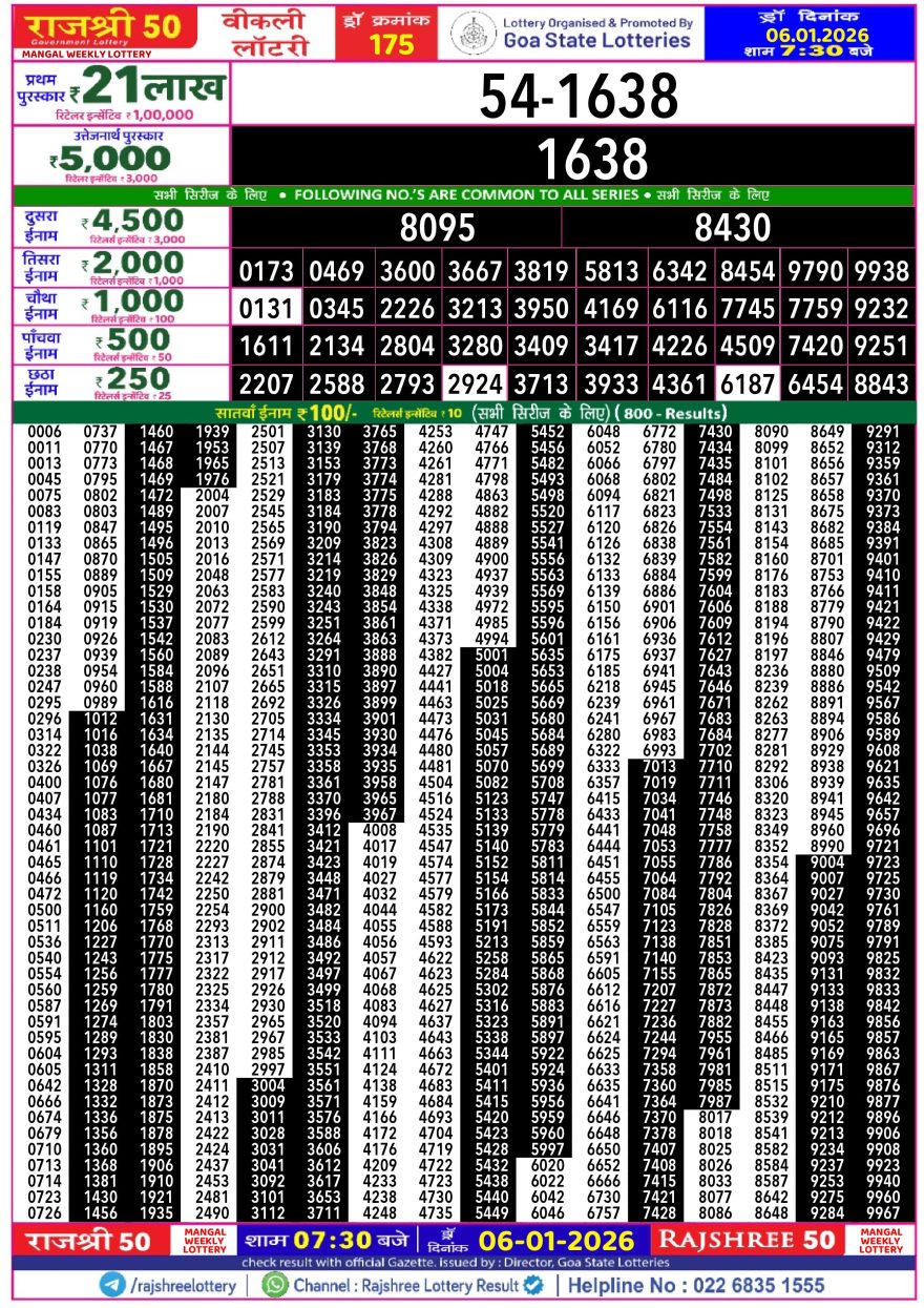 Rajshree 50 Mangal Weekly lottery 07.30PM 06.01.2026 06.01.2026 Leave a Comment on Rajshree 50 Mangal Weekly lottery 07.30PM 06.01.2026 Share: XFacebookPinterestLinkedin