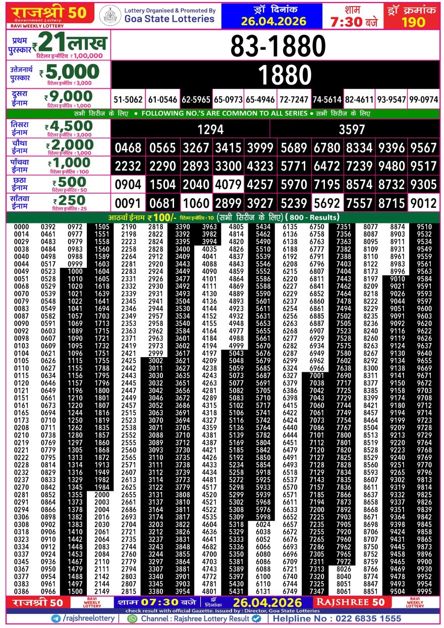 Rajshree 50 Ravi Weekly lottery 07.30PM 26.04.2026 26.04.2026 Leave a Comment on Rajshree 50 Ravi Weekly lottery 07.30PM 26.04.2026 Share: XFacebookPinterestLinkedin