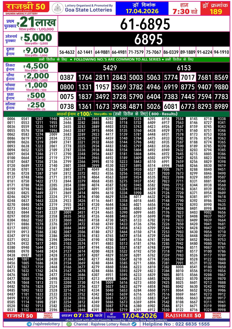 Rajshree 50 Shukra Weekly lottery 07.30PM 17.04.2026 17.04.2026 Leave a Comment on Rajshree 50 Shukra Weekly lottery 07.30PM 17.04.2026 Share: XFacebookPinterestLinkedin