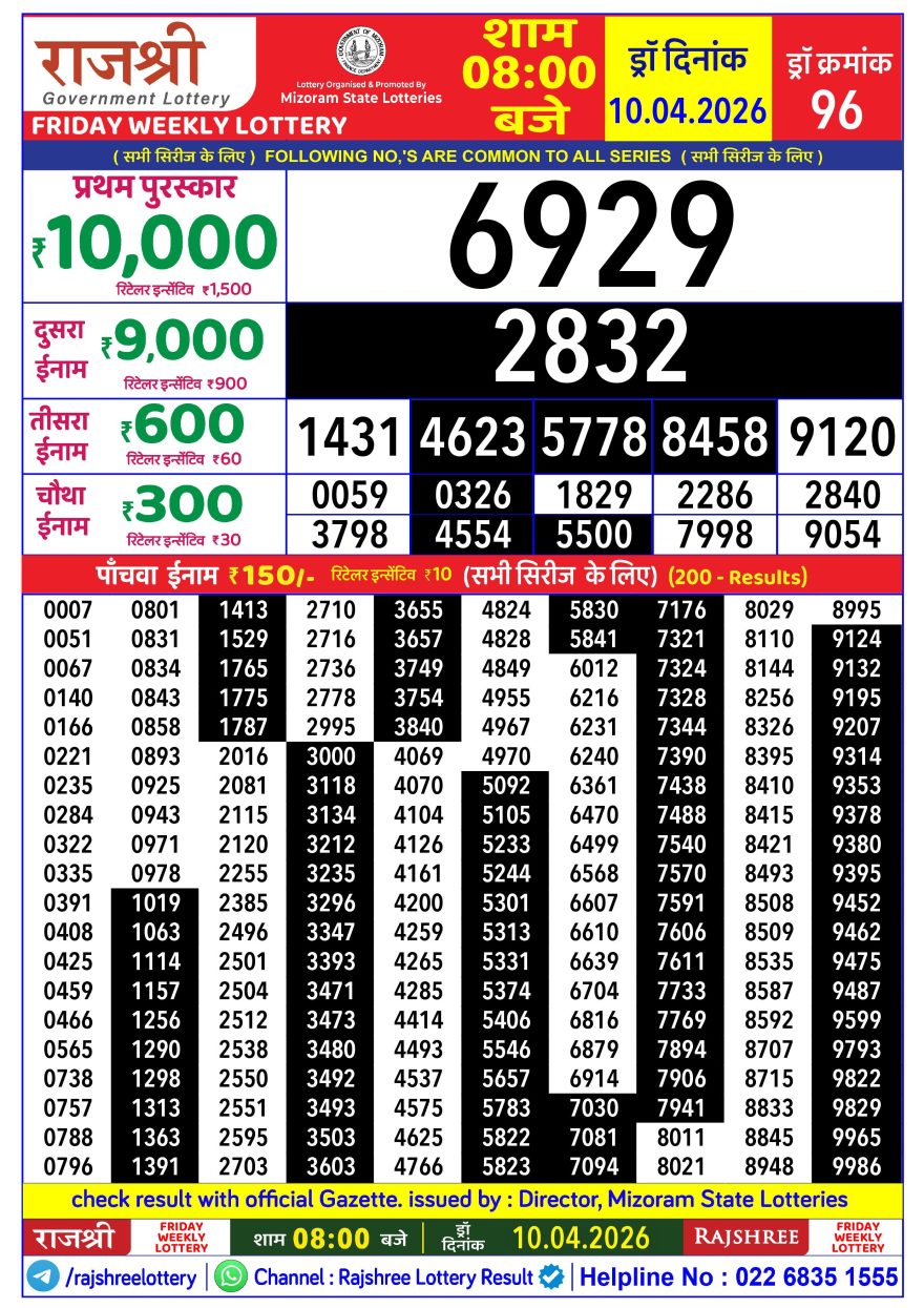Rajshree Friday Weekly lottery 08.00PM 10.04.2026 10.04.2026 Leave a Comment on Rajshree Friday Weekly lottery 08.00PM 10.04.2026 Share: XFacebookPinterestLinkedin