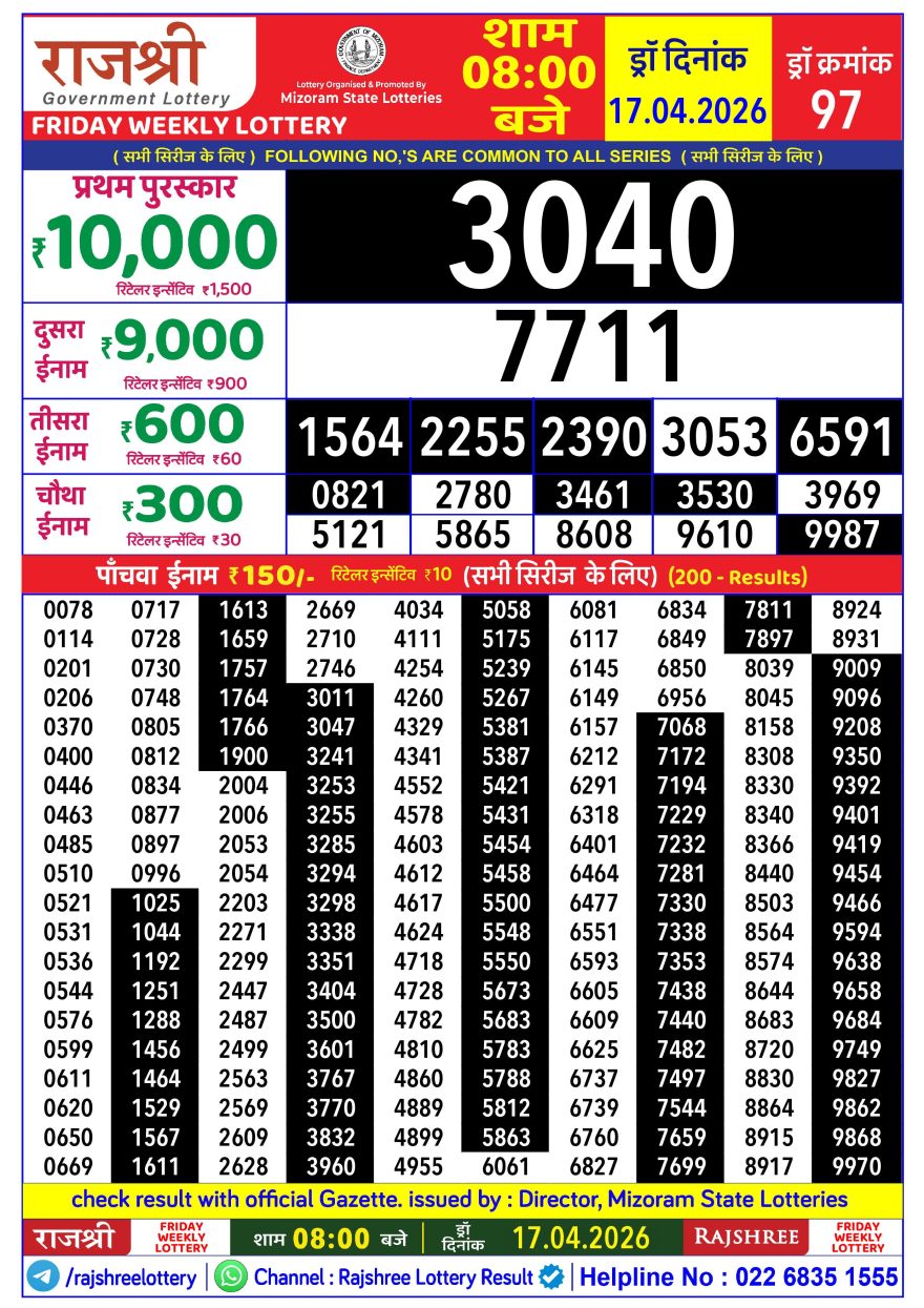 Rajshree Friday Weekly lottery 08.00PM 17.04.2026 17.04.2026 Leave a Comment on Rajshree Friday Weekly lottery 08.00PM 17.04.2026 Share: XFacebookPinterestLinkedin