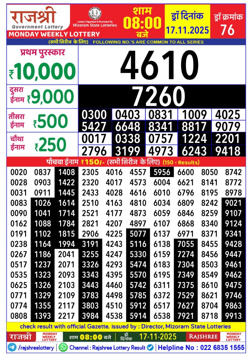 Rajshree Monday Weekly lottery 08.00PM 17.11.2025 17.11.2025 Leave a Comment on Rajshree Monday Weekly lottery 08.00PM 17.11.2025 Share: XFacebookPinterestLinkedin