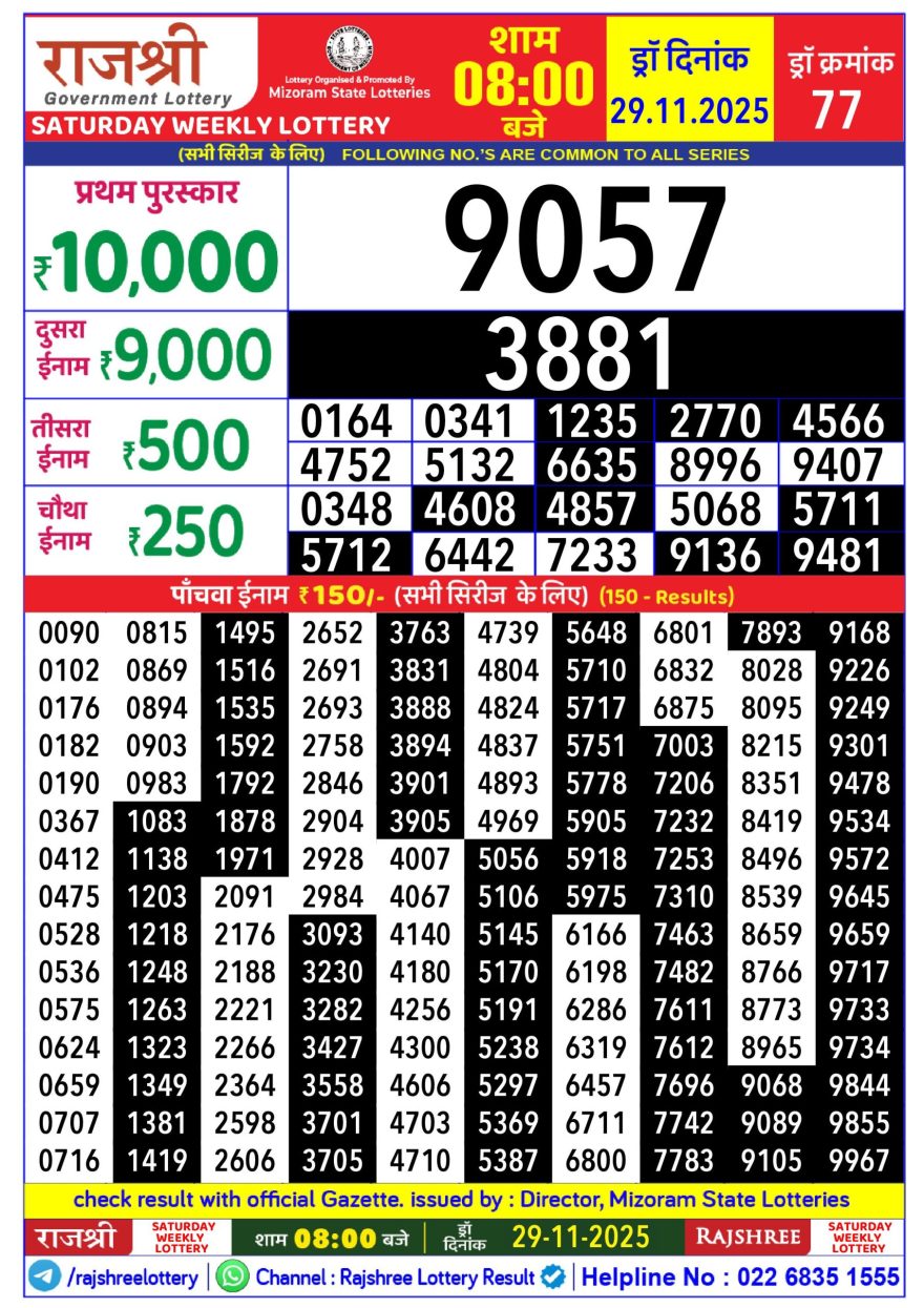 Rajshree Saturday Weekly lottery 08.00PM 29.11.2025 29.11.2025 Leave a Comment on Rajshree Saturday Weekly lottery 08.00PM 29.11.2025 Share: XFacebookPinterestLinkedin