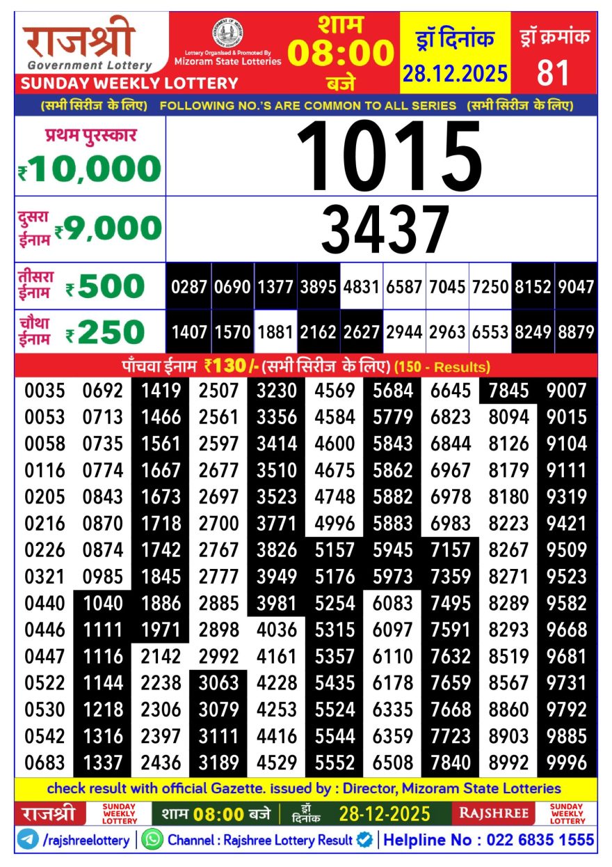 Rajshree Sunday Weekly lottery 08.00PM 28.12.2025 28.12.2025 Leave a Comment on Rajshree Sunday Weekly lottery 08.00PM 28.12.2025 Share: XFacebookPinterestLinkedin