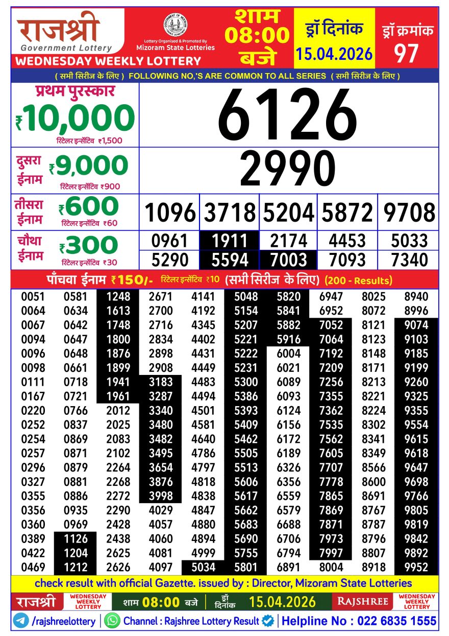 Rajshree Wednesday Weekly lottery 08.00PM 15.04.2026 15.04.2026 Leave a Comment on Rajshree Wednesday Weekly lottery 08.00PM 15.04.2026 Share: XFacebookPinterestLinkedin
